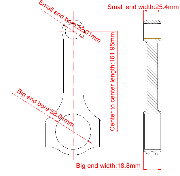 Brand: Hurricane Engine: Honda Acura RSX 2.0 VTEC K20 K20A K20A2Part Type: Connecting RodsCenter to Center Length: 138.98mm/5.472"Big End Bore Diameter: 51mm/2.008"Big End Width: 19.8mm/0.7795"Small End Bore Diameter: 22mm /0.8661"Small End Width: 19.8mm/0.7795"Beam Style: H-beam